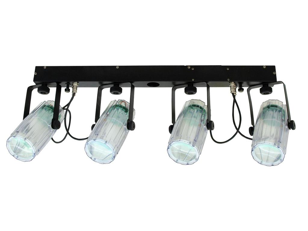 Complete LED light set consisting of 4 LED spots and a crossbar with an integrated DMX control unit and mounting hole (36 mm) with fixation screw for installation on a truss system or stand