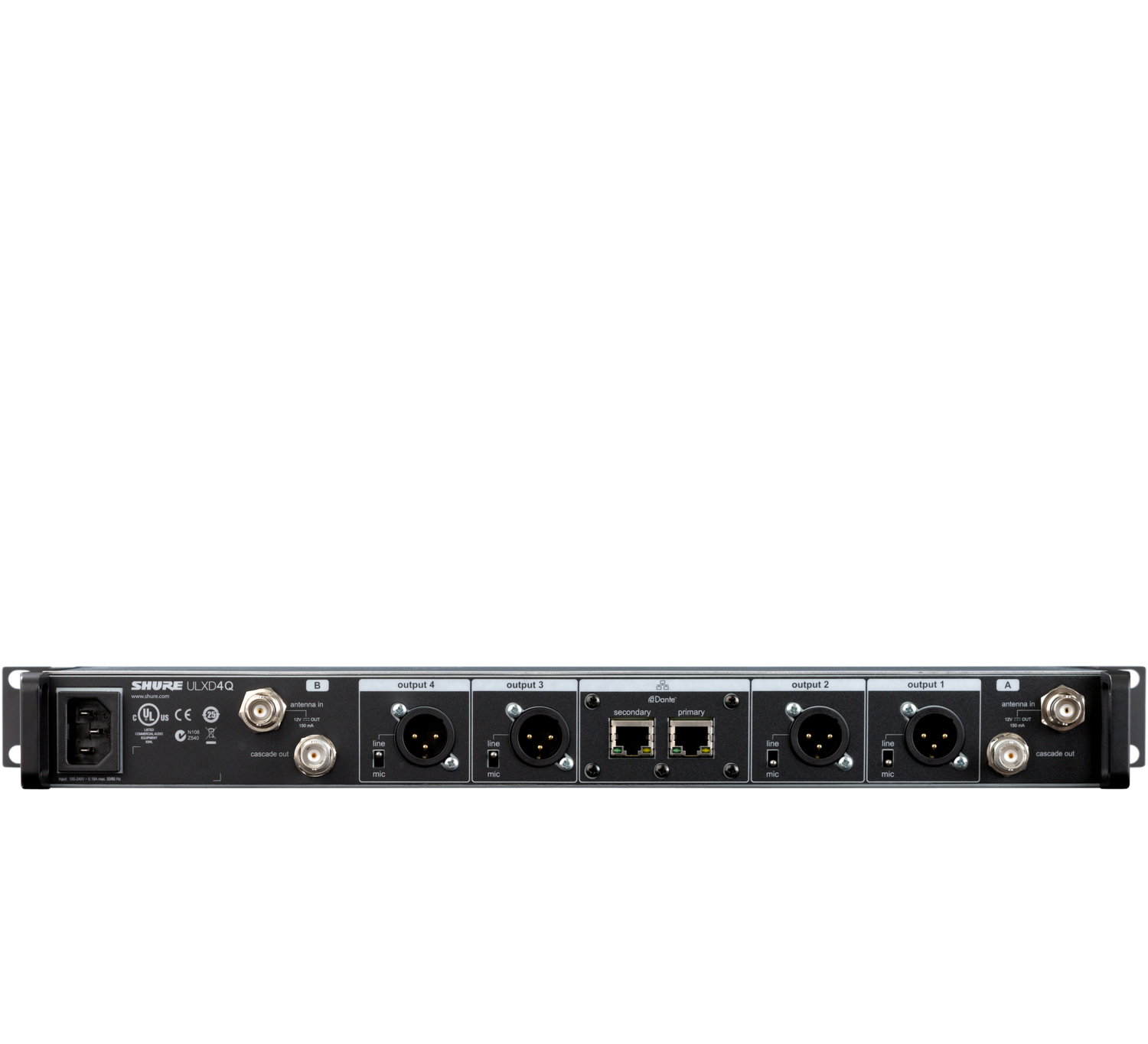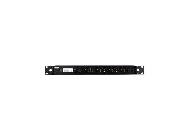 The Shure ULXD4Q Quad Channel Digital Wireless Receiver offers four channels of uncompromising audio quality, RF signal stability, and advanced setup features in a space-efficient single rack unit. Rugged yet lightweight and compact, the 1RU all-metal chassis houses four independent receivers, each with its own audio and RF meters, gain control, and XLR outputs that can be either direct or summed for flexible signal routing.